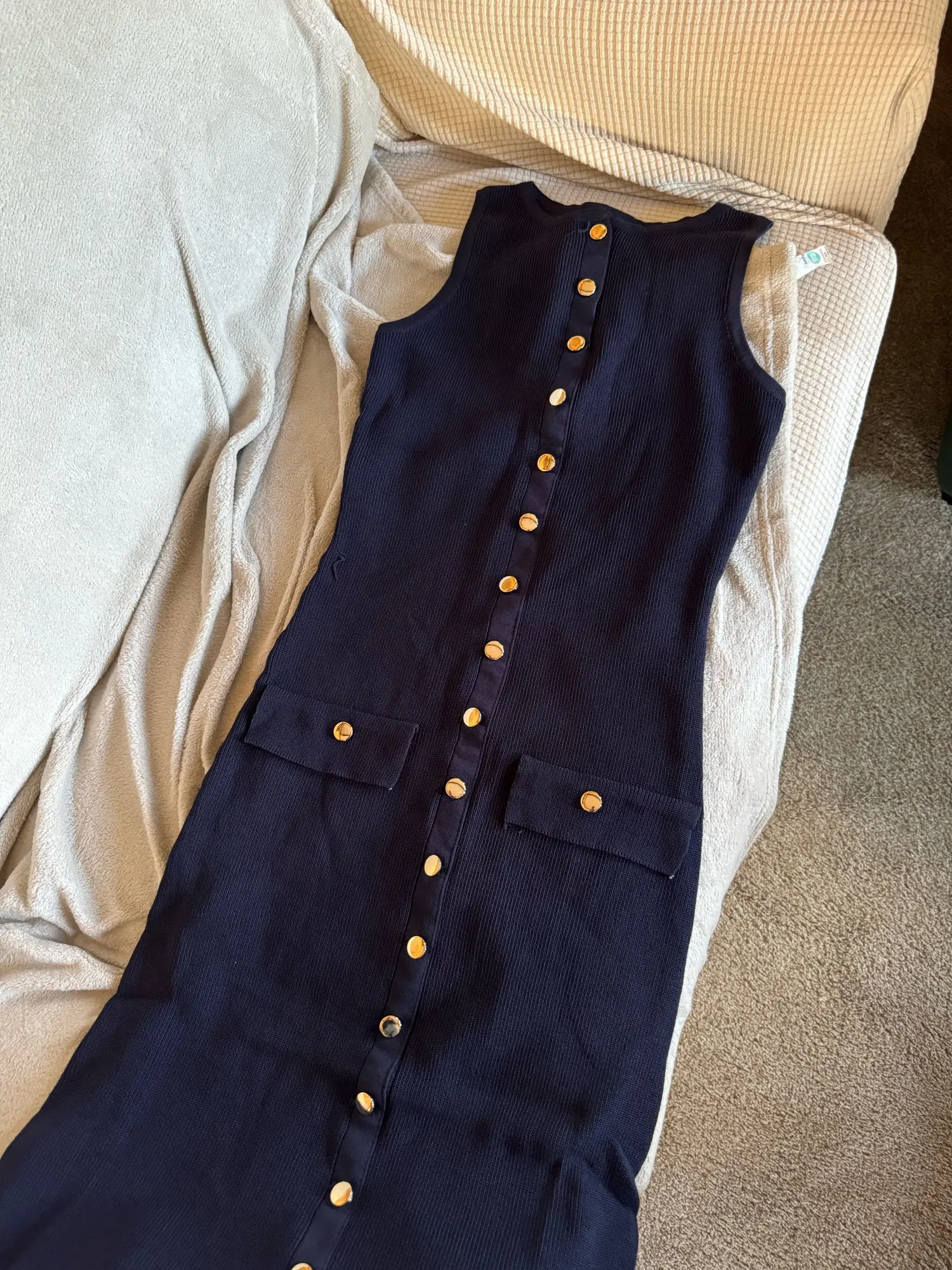 C'est exactement comme sur la photo. Jolis boutons or prennent votre propre taille. Un tissu épais ne sait pas s'il convient aux vraies journées chaudes